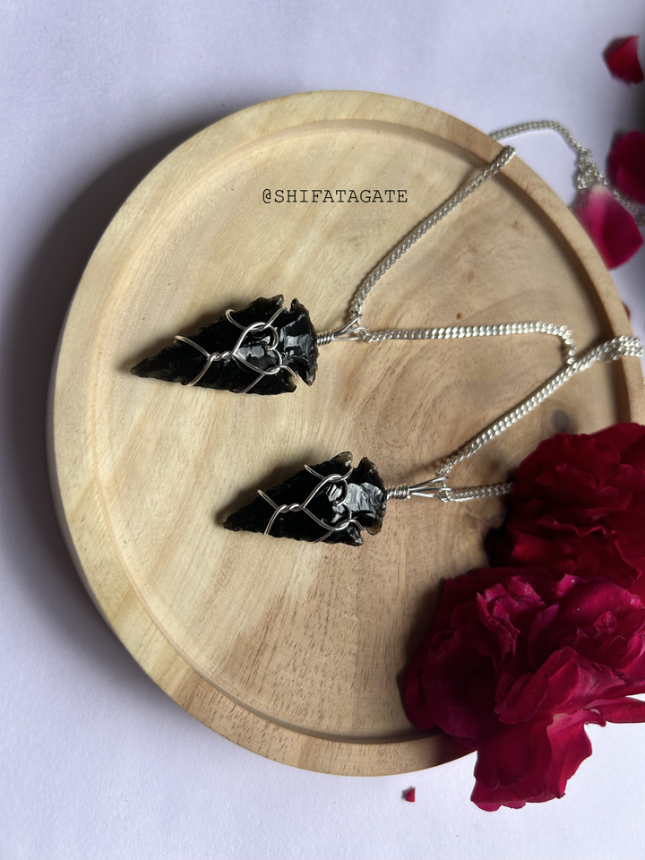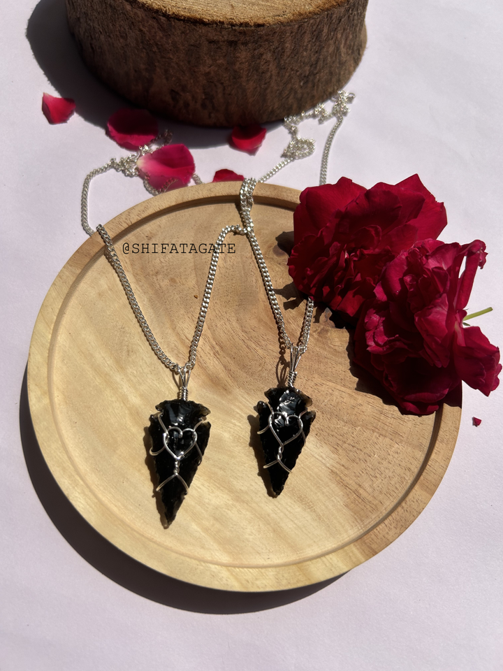 Wholesale Trendy Feng Shui Necklace Hand-Carved Black Obsidian Heart Silver Plated Crystal Arrowhead Pendant Spiritual Jewelry