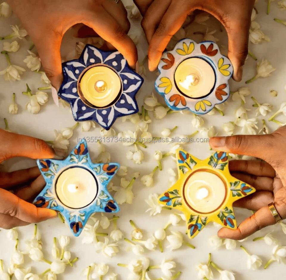 Wholesale Small Hand Painted ECO-friendly Ceramic Luxury Unique Blue Pottery Tea Light Candle Holder Christmas Decoration