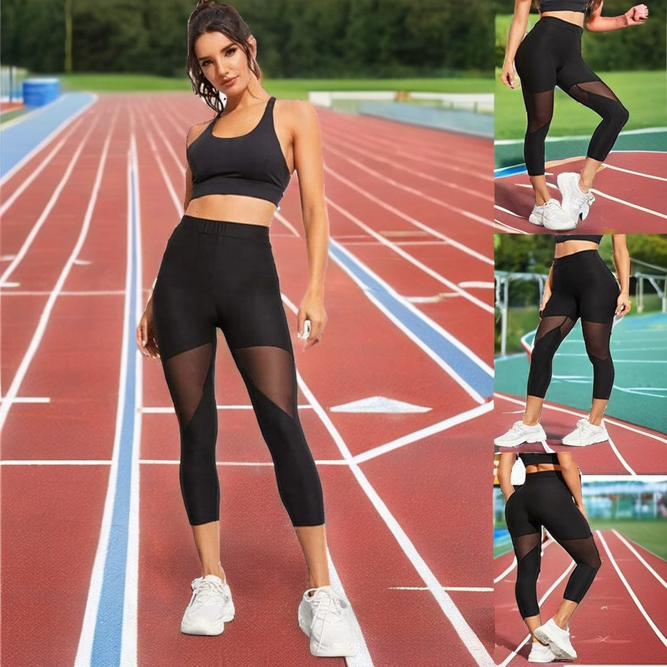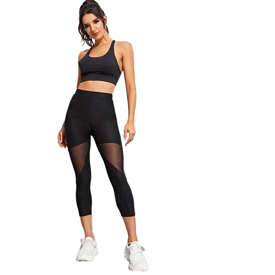 Wholesale Solid Black Mesh High Elastic Waist Quick Dry Calf-Length Yoga Leggings with Pockets for Women