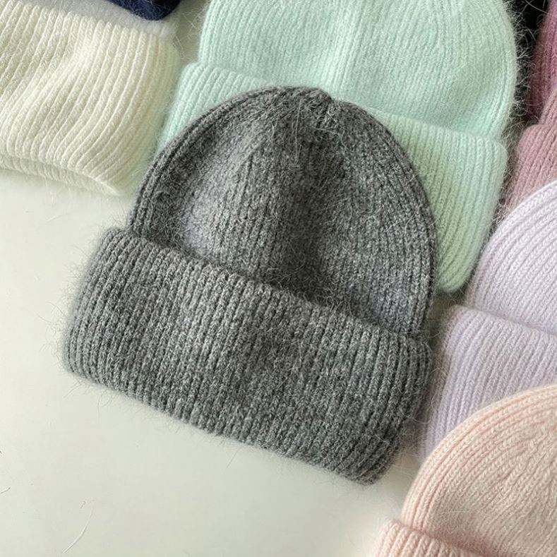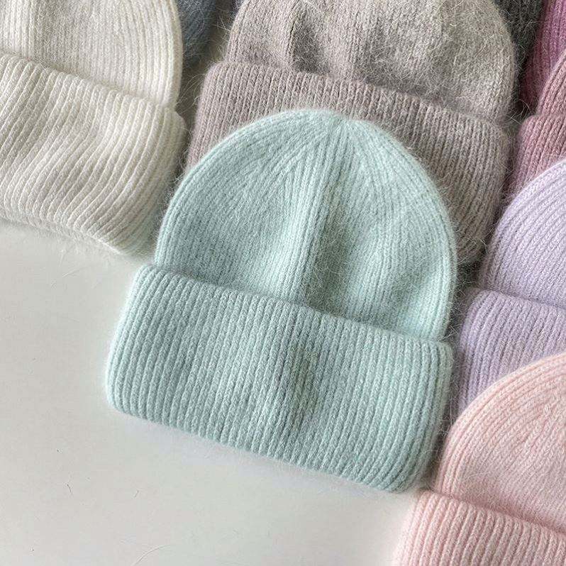 Wholesale Solid Color Angora Rabbit Fur Winter Cap Custom Logo Women Men Fisherman Classic Cuffed Ski Style Knitted Beanies Hat
