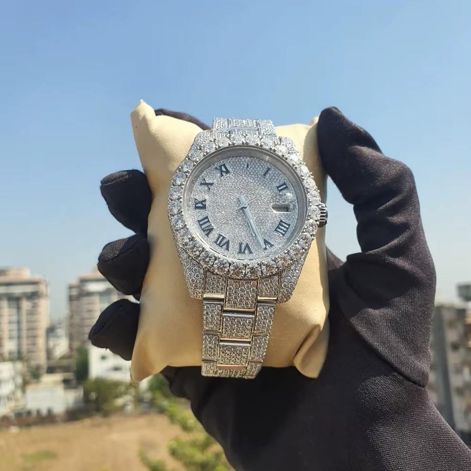 Wholesale Stainless Steel Moissanite Quartz Movement VVS1 Diamond Iced Out Roman Numeral Luxury Bangle Watch with Pointer Dial