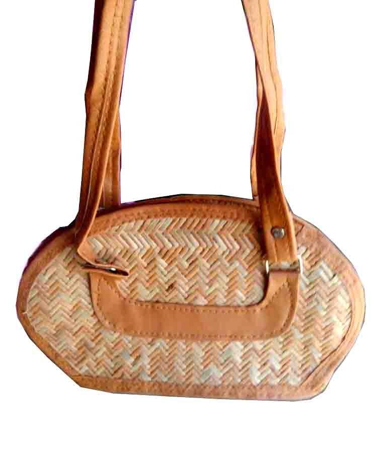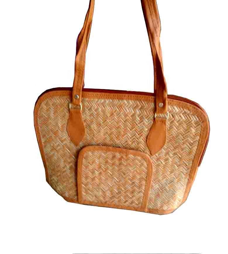 Wholesale Straw Beach Bag Women Stripe Handbag With Leather Handle Straw Handbag by Handmade Ethnic Style