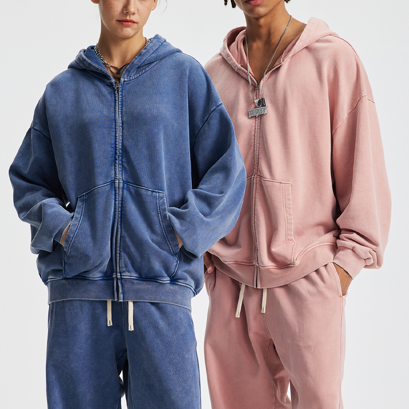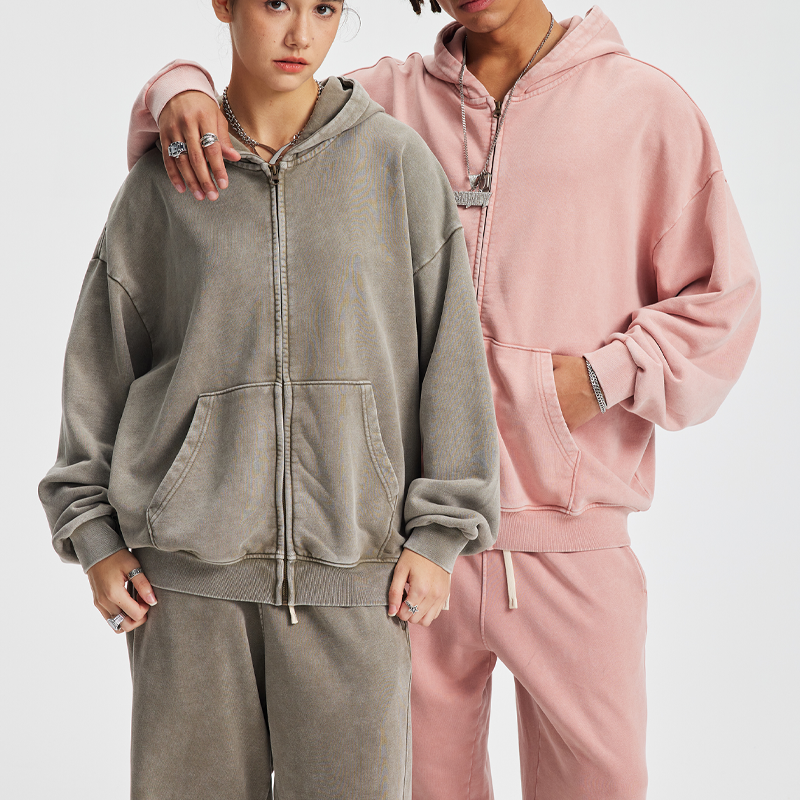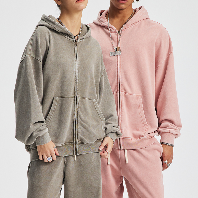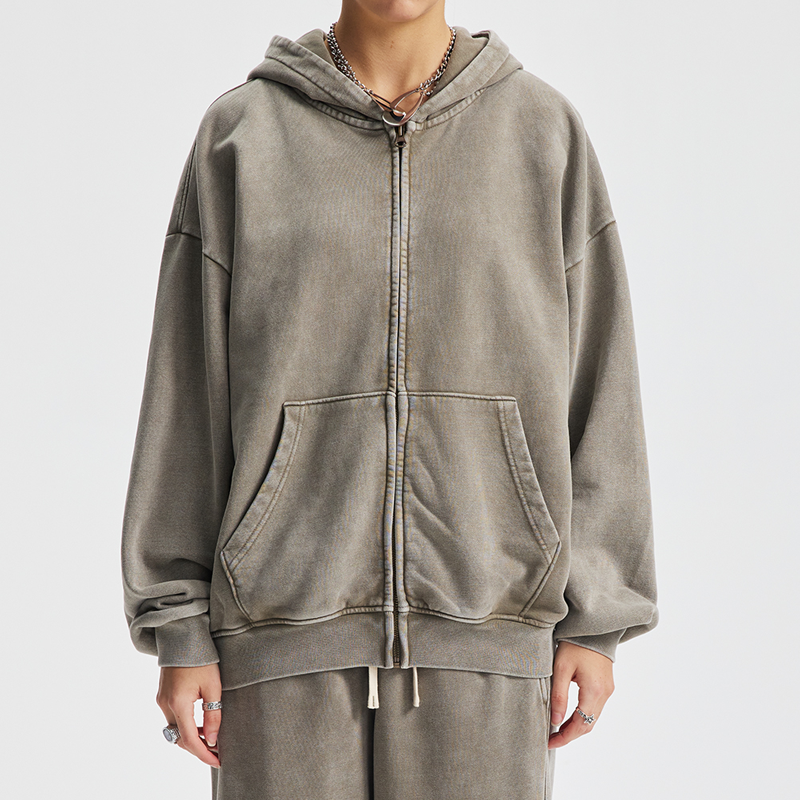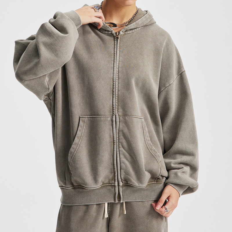 Wholesale Streetwear Heavyweight Oversized Washed Hoody Custom logo No String Zip up Pullover Men's Hoodie
