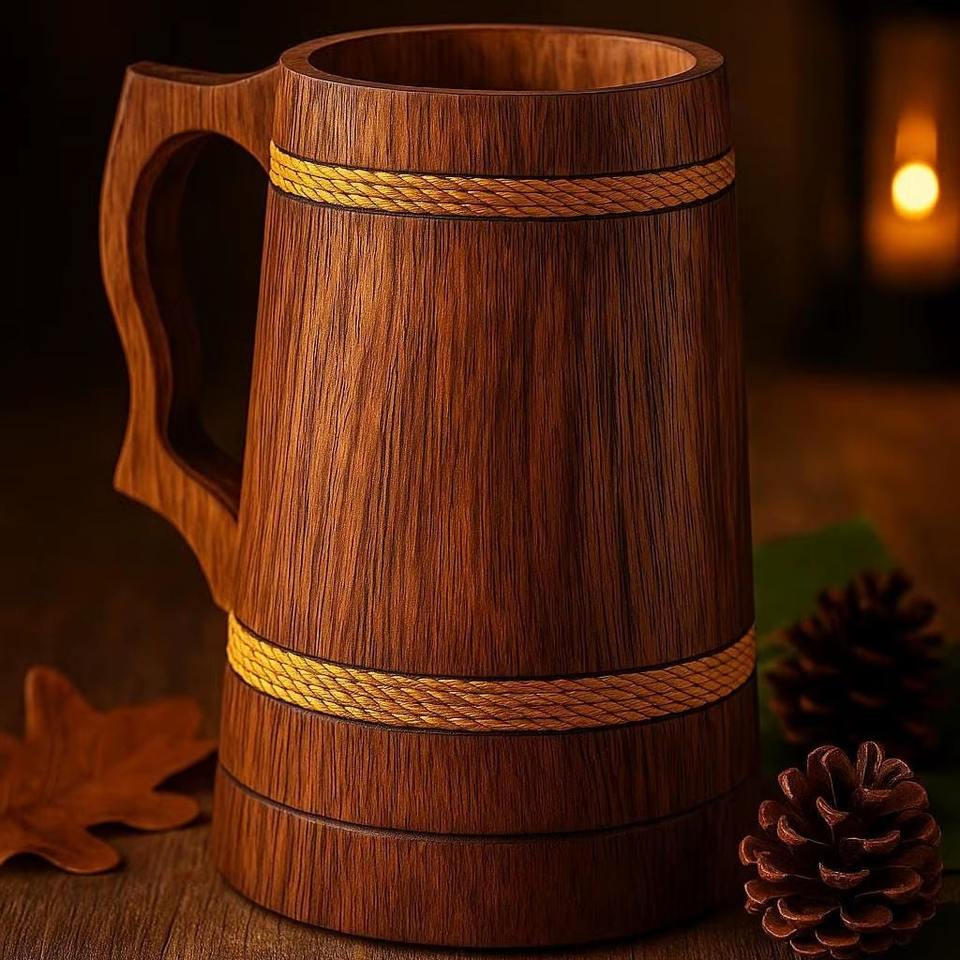 Wholesale Stylish Viking Beer Mug Handmade Retro Brown Oak Wood Carving Tankard Feng Shui Religious Style Cup Angel Love Design