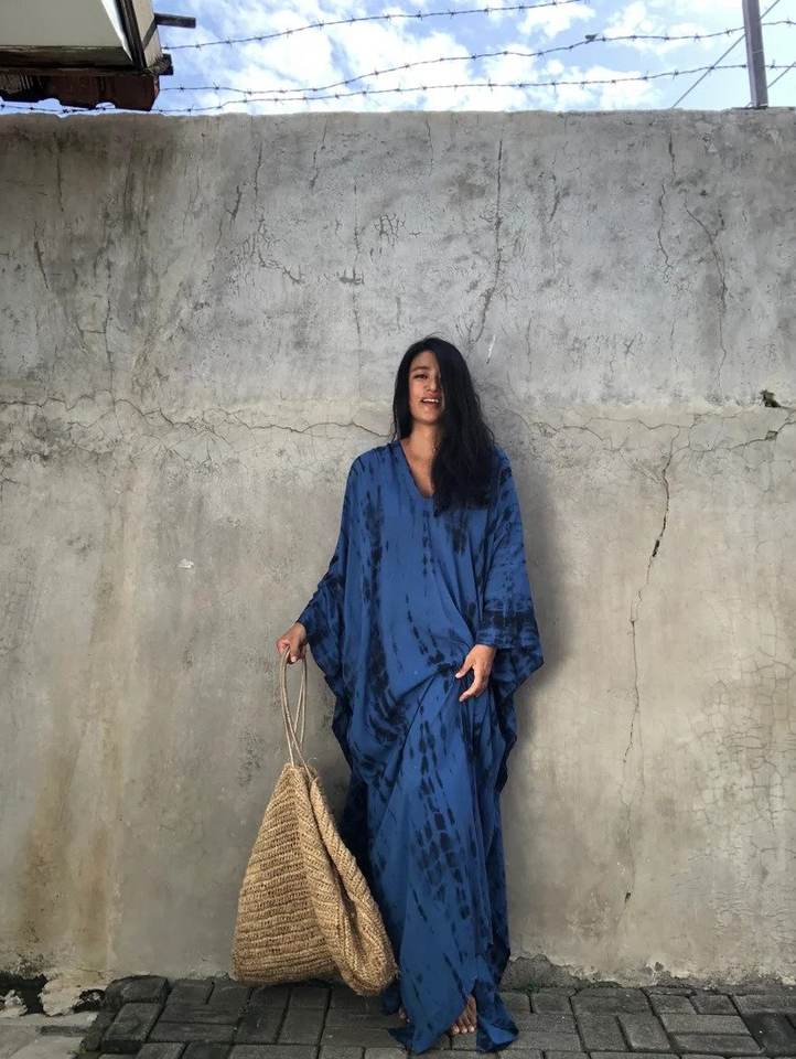 Wholesale Summer Blue Floral Tie-Dye V-Neck Kaftan Dress Maxi Length Long Sleeves Free Size Breathable Woven Beach Dress Natural