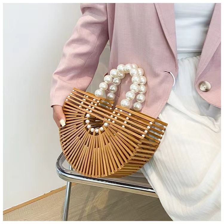 Wholesale Summer Hollow Half-Round Handbags Ladies Bamboo Bag Knitted Pearl Handle Bamboo Woven Bag