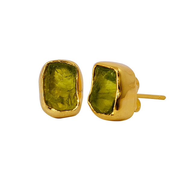 August Birthstone Stud Earrings Natural Raw Peridot Gemstone Gold Plating Collet Setting Trendy Brass Jewelry Wholesale Supply