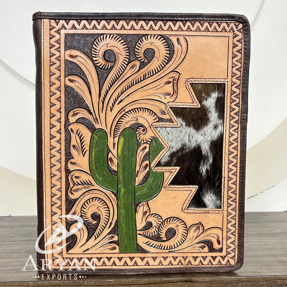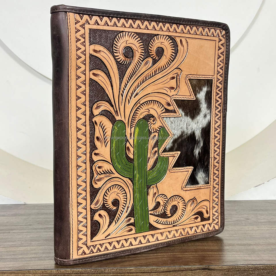 Wholesale Tooled Leather File Folder Executive Folder 3 Ring Binders for Documents High Quality Cowhide Leather Zipper Portfolio