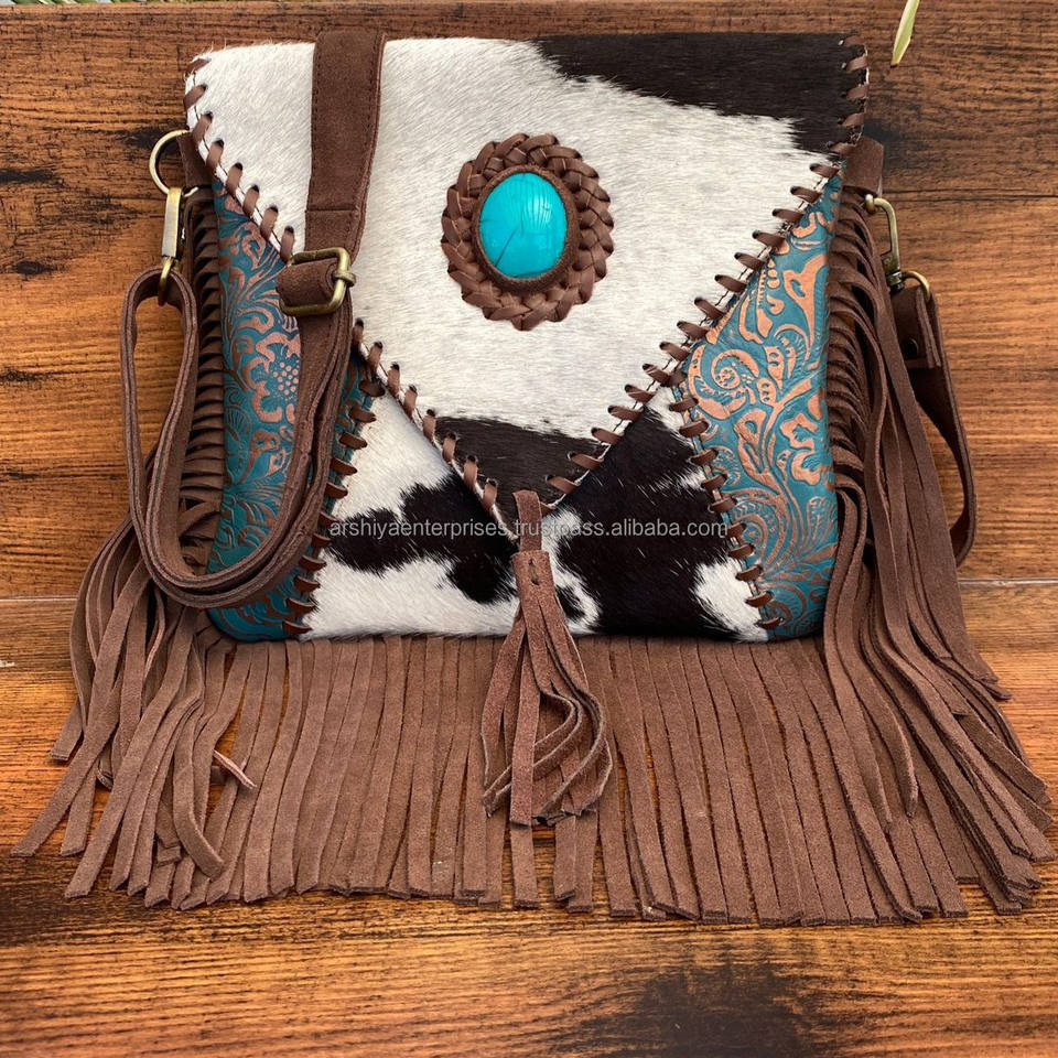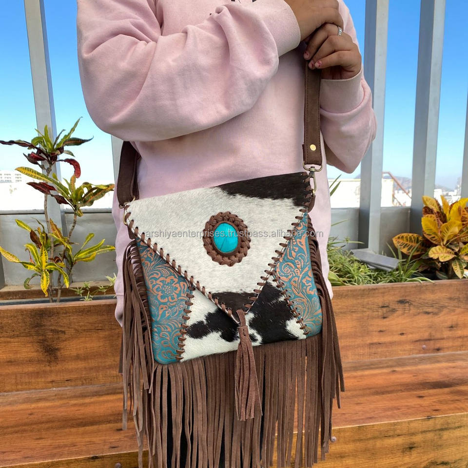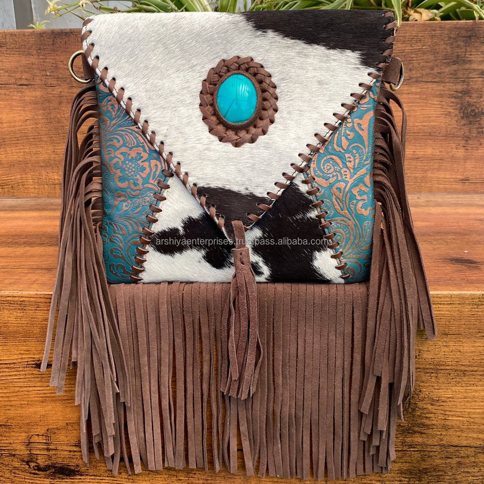 Wholesale Top Products New Cowhide Leather Fringe Handbag Cowhide Crossbody Purses Western Stylish Turquoise Stone Sling Bags