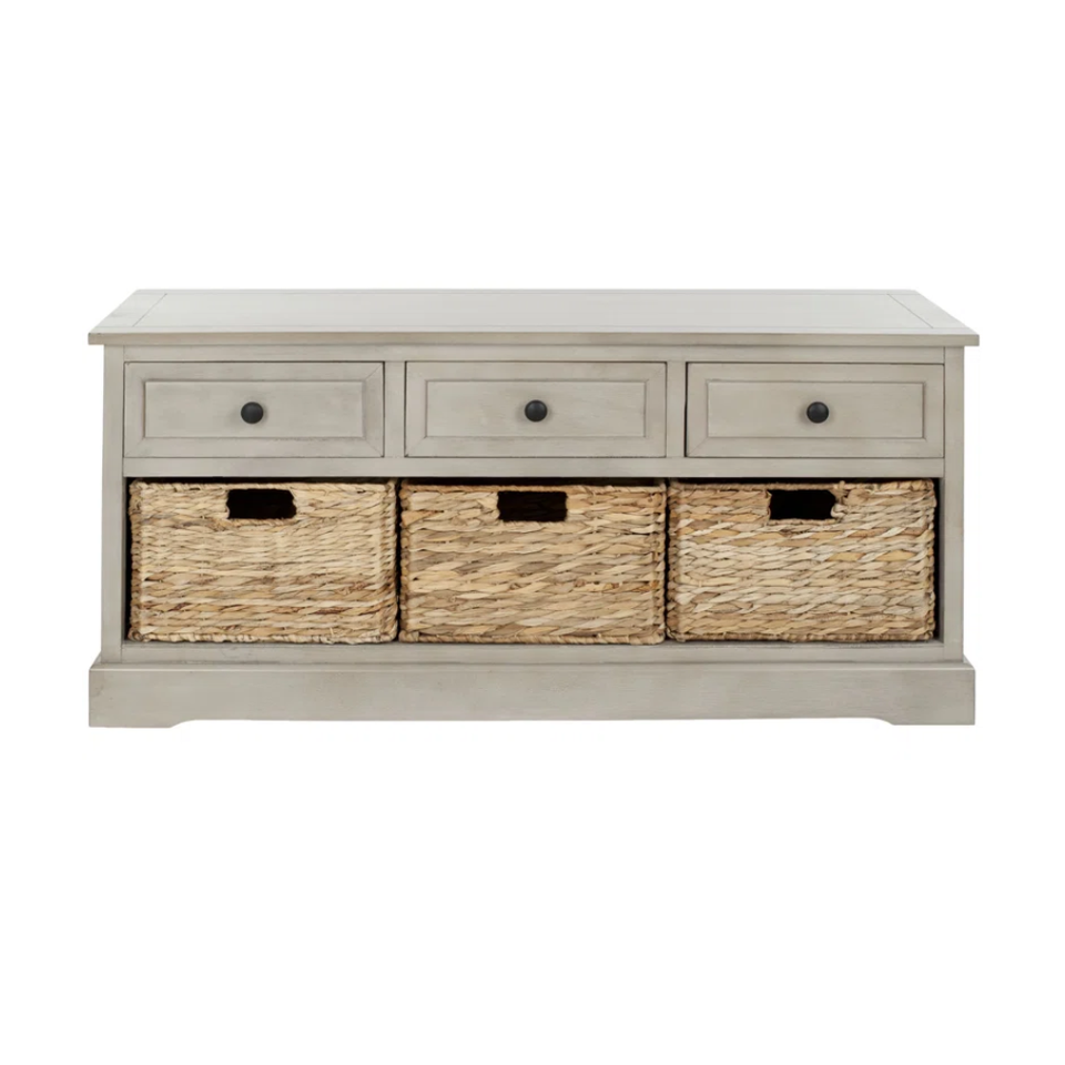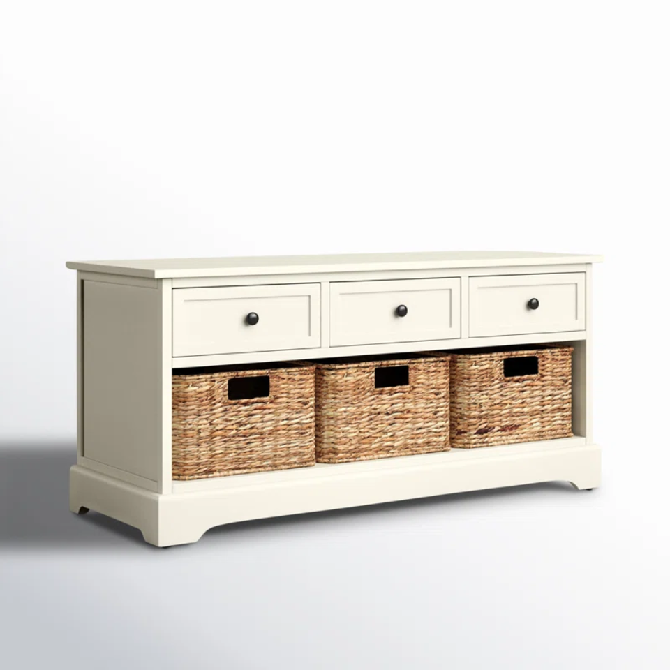 Solid wood 3-drawer storage bench with water hyacinth storage baskets
