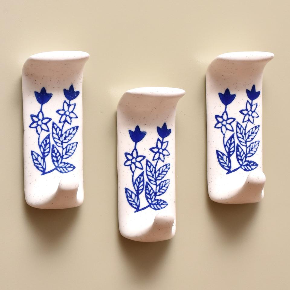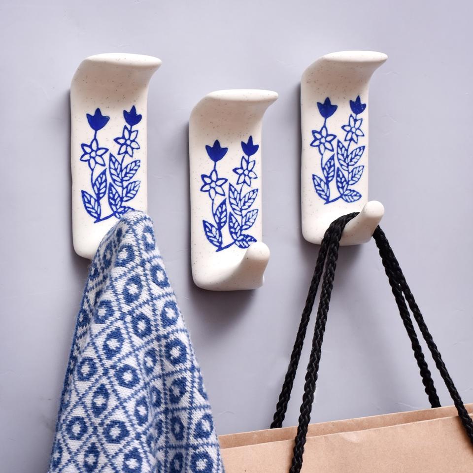 Ceramic Blue Floral Sticky Hook for Wall