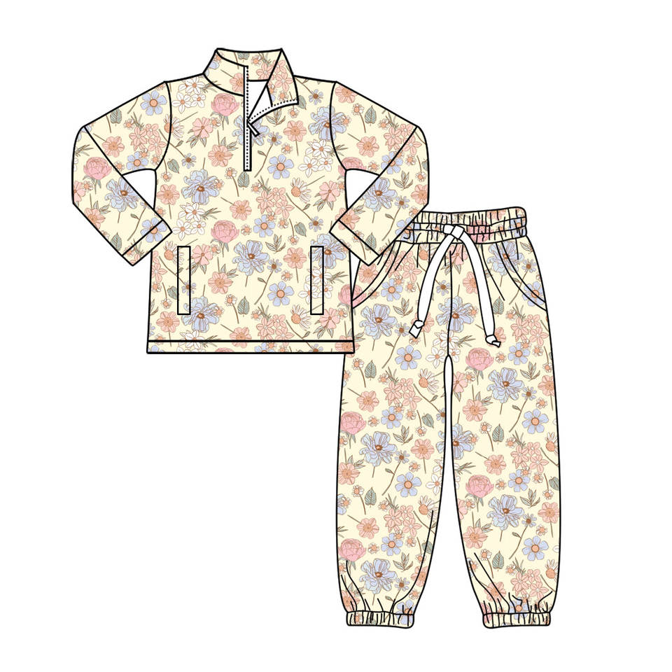 Wholesale Trendy Fashion Kids Girls Clothing High Quality Toddler Girls Floral Zipper Pullover Top With Jogger Set