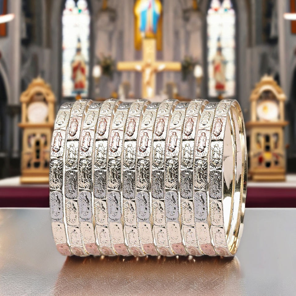 Wholesale Tri-Color Gold Nuestra Senora De Guadalupe Bangles, Everyday Wear Catholic Bangles, Brass 3 Tone Bangles Oro Laminado.
