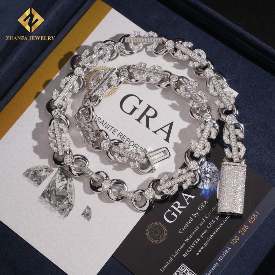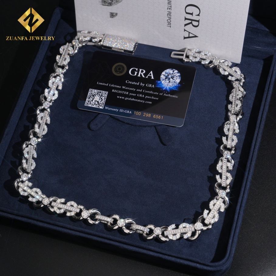 Wholesale US Dollar-Shaped 8-character Cuban Chain Moissanite Cuban Link Chain Necklace Men Hip Hop Iced Out Diamond 925 Silver