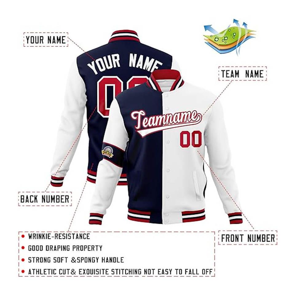 Wholesale Varsity Baseball Jacket Standard Thickness for Men Stand Collar Breathable Featuring Stitched Text Logo in Navy White