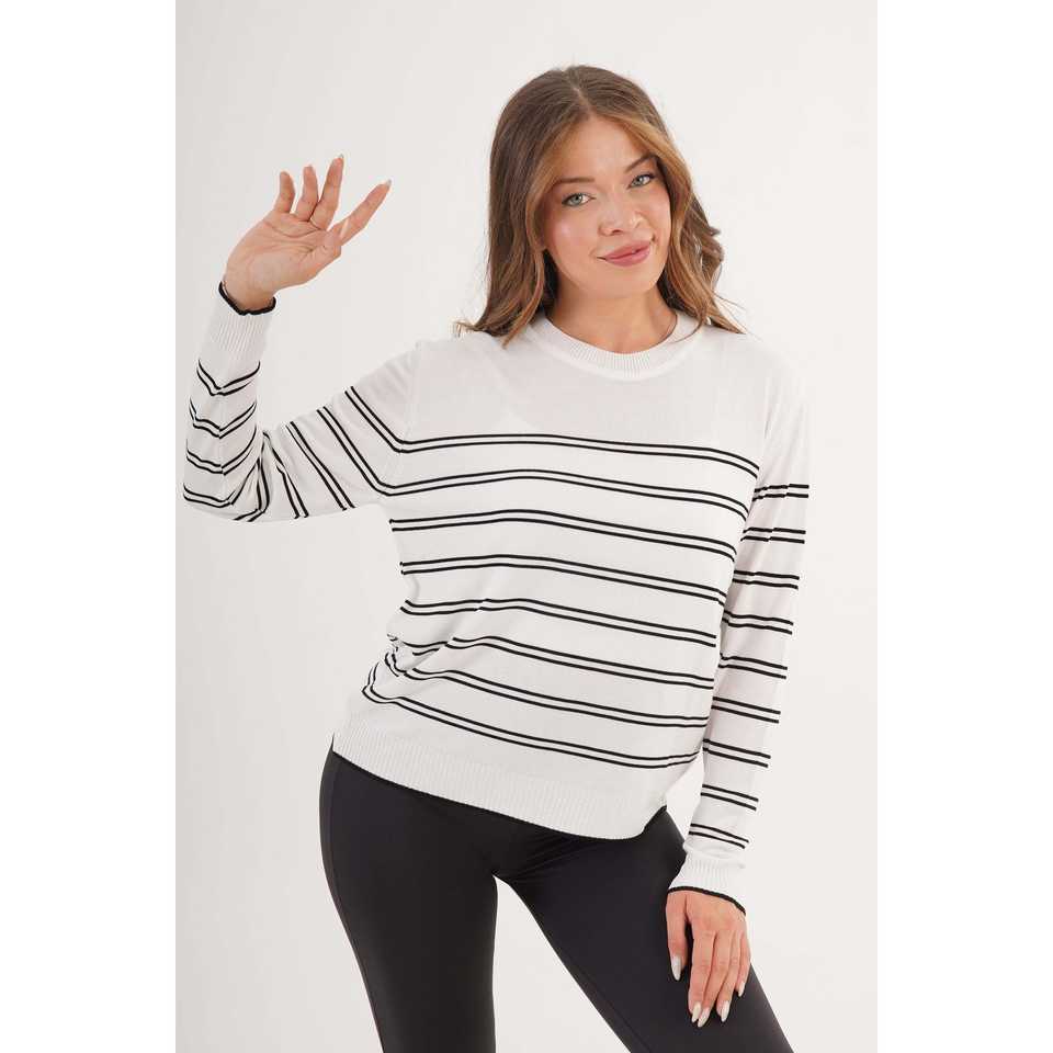 Wholesale Vintage Style Crew Neck Striped Knit Sweater for Women White Long Length Button Decoration Casual for Autumn Beach
