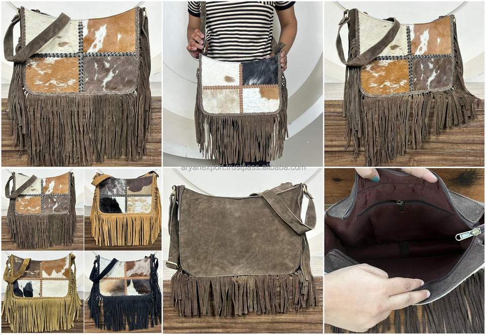 Wholesale Western Style Genuine Cowhide Leather Patchwork Fringe Crossbody Bag Luxury Suede Shoulder Purse Handbag for Women's