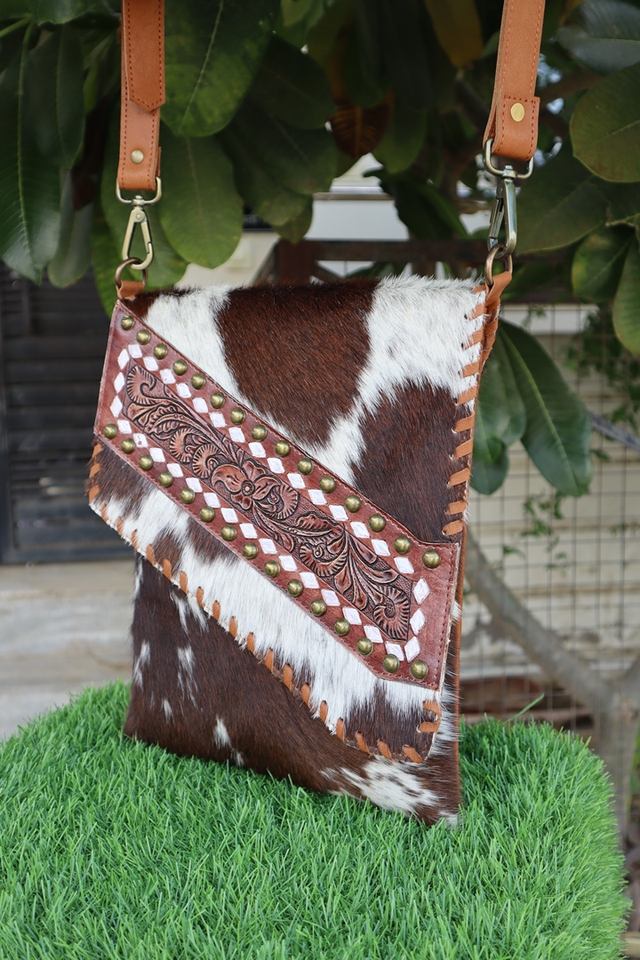 Product:Hand Tooled Hair on Leather Messenger Bag