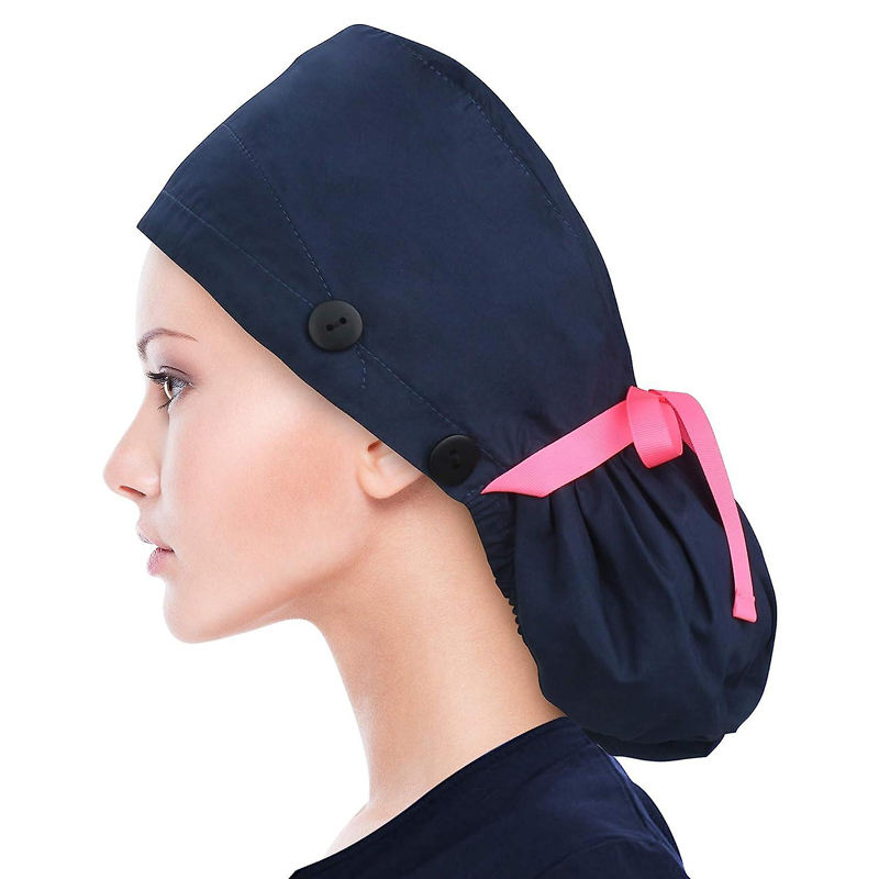 Wholesale Women Long Hair Scrub Hats With Buttons Custom Embroidery Print Logo Nurse Ponytail Caps Satin Lined Scrub Caps