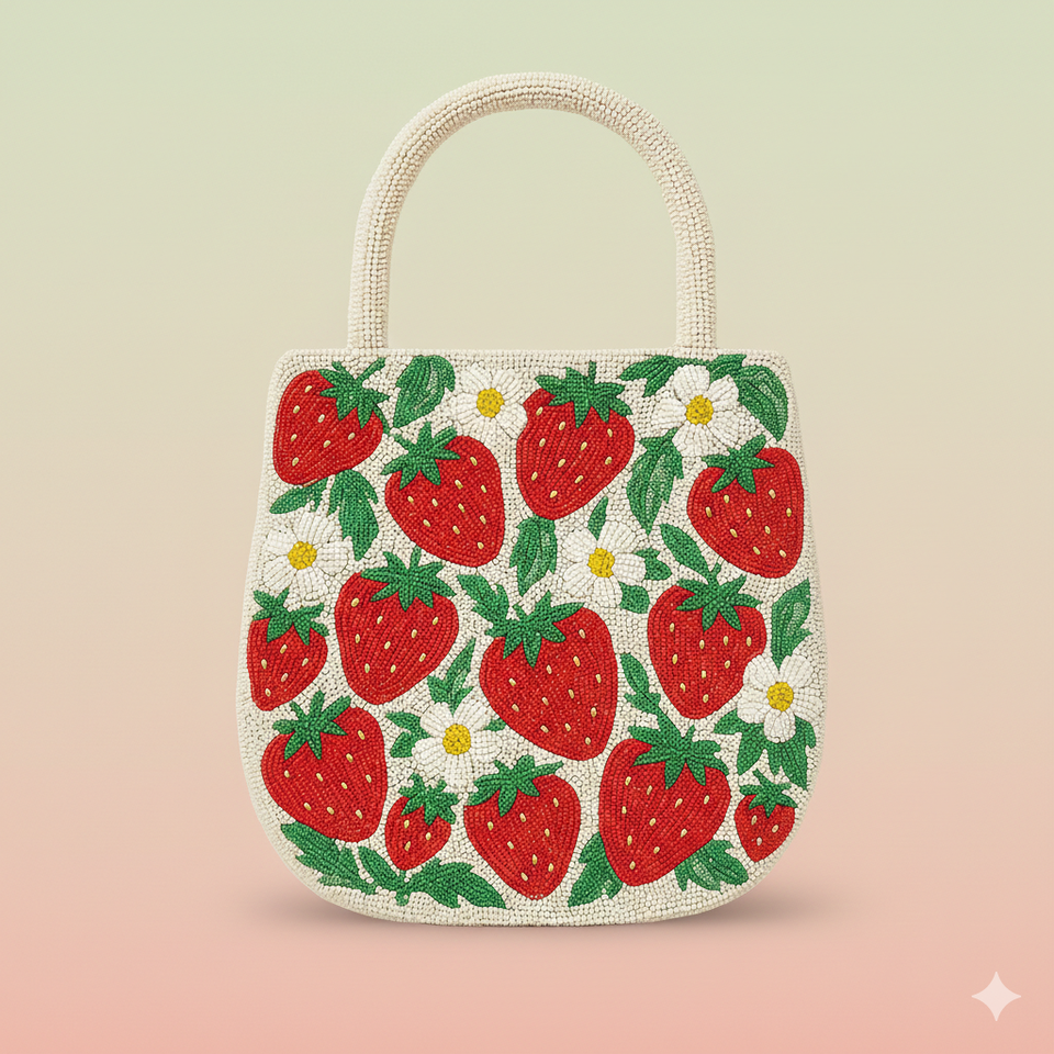 Wholesale Women Sweet Strawberry Blossom Beaded Handbag Red Berry Embroidery Zipper Closure Landscape Pattern Casual Handbags