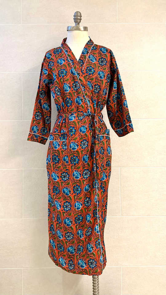Wholesale Women's 100% Cotton Floor-Length Bath Robe Long Sleeve Solid Pattern Digital Printed Side Pockets Back Logo Vintage