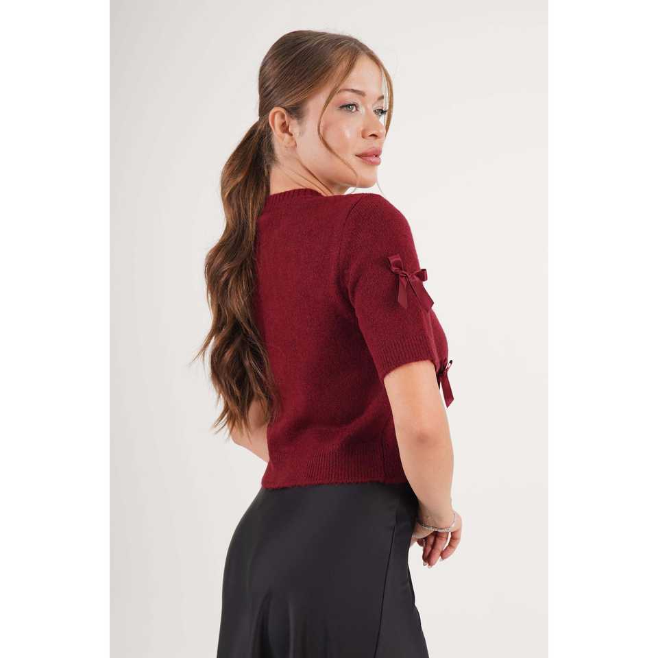 Wholesale Women's Burgundy Short Sleeve Knitted Cardigan Bow Ribbon Design