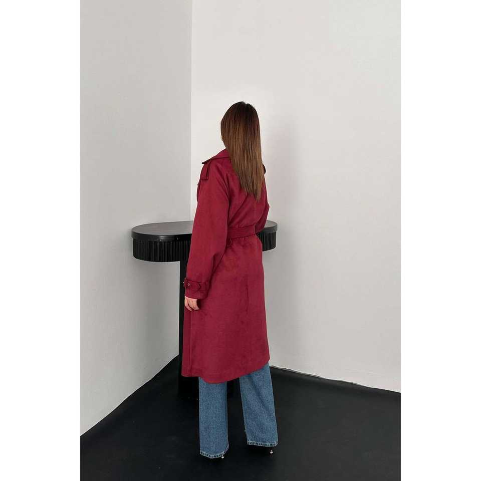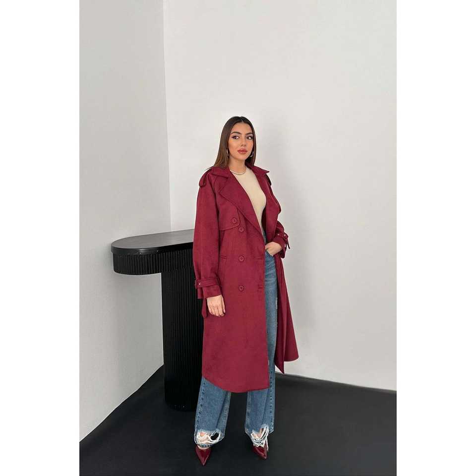 Wholesale Women's Burgundy Suede Trench Coat Raglan Sleeves Long Casual Winter Coat Waterproof Feature Cotton Autumn Print