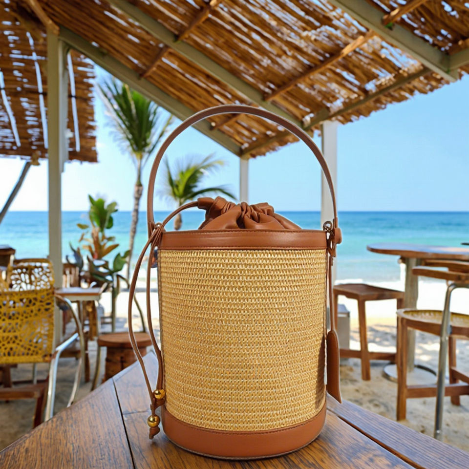 Wholesale Women's Crossbody Bag Hand Woven Flax Raffia Leather Bucket Bag with String Closure Summer Style Shoulder Tote Bag