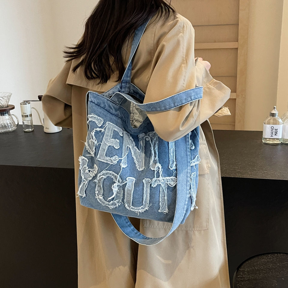 Keywords:Minimalist Style Raw Edge Letter Design Jeans Canvas Tote Bag