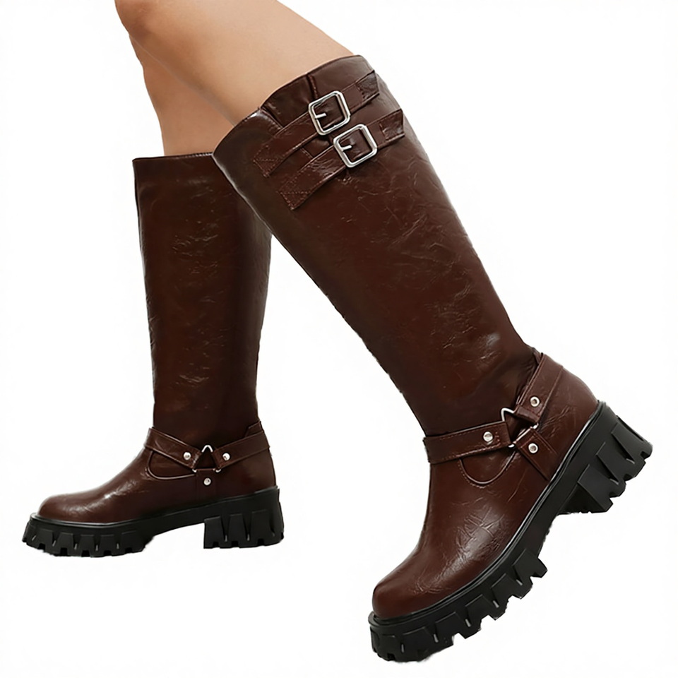Wholesale Women's Solid Chunky Heel Knee-High Boots with Metal Buckles Thick Sole for Winter Autumn Spring