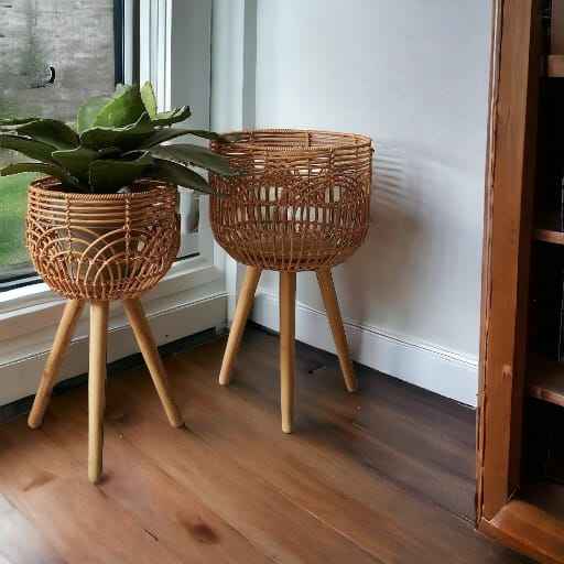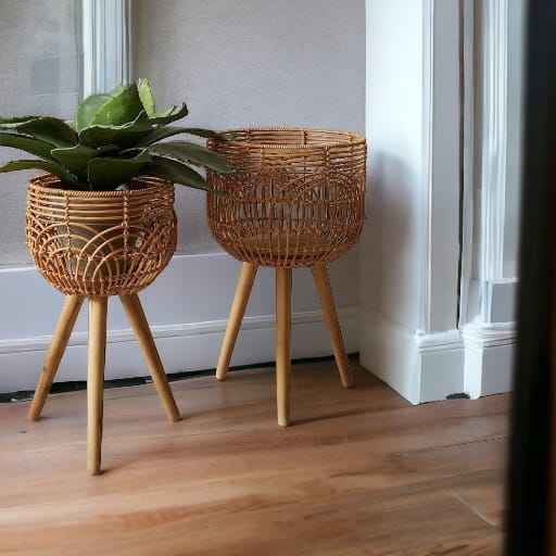 Natural Resin Rattan Round Planter with Wood Legs and Stand