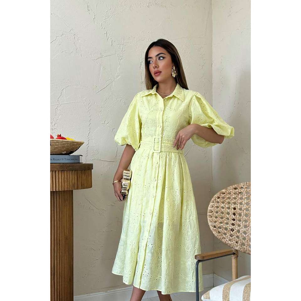 Wholesale XL Yellow Pleated Balloon Sleeve Knee-Length Floral Print Translucent Modest Formal Vintage Spandex Lining for Day