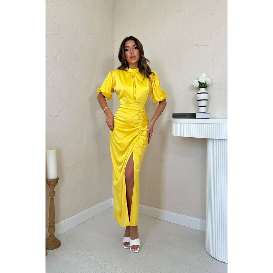 Wholesale Yellow Ruched Satin Cocktail Dress
