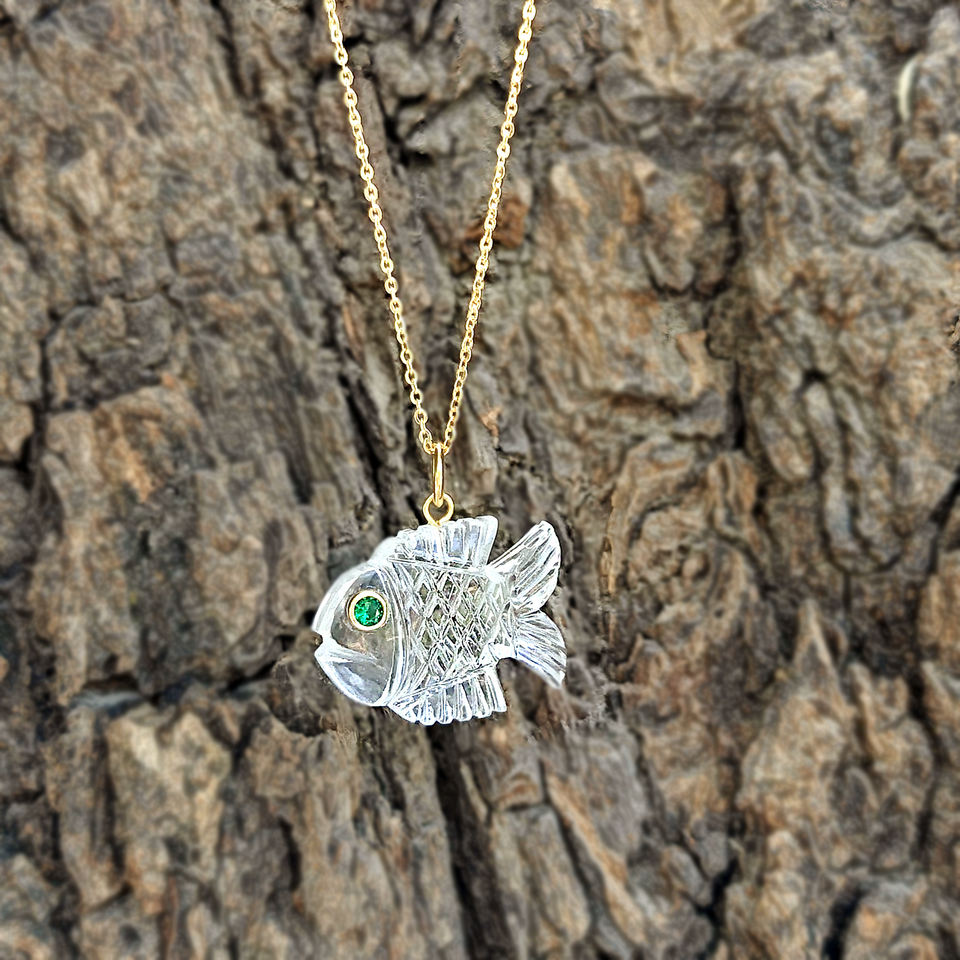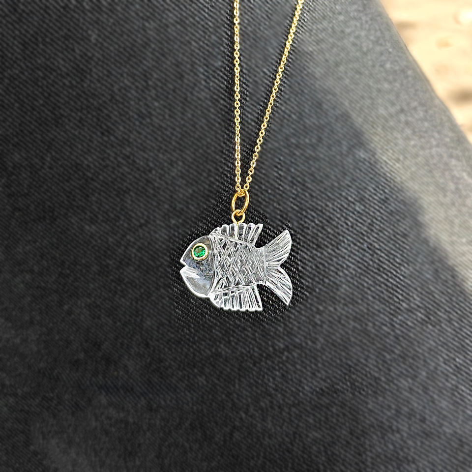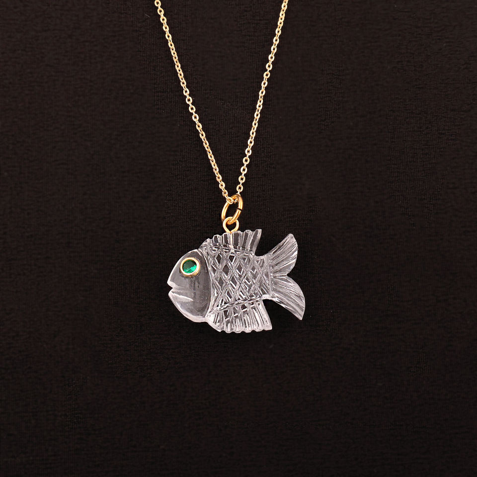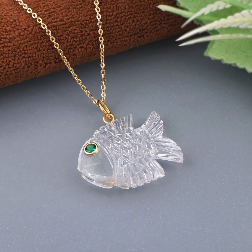 Wholesale crystal quartz carved fish pendant with green CZ eye april birthstone lightweight brass gold plated women's jewelry