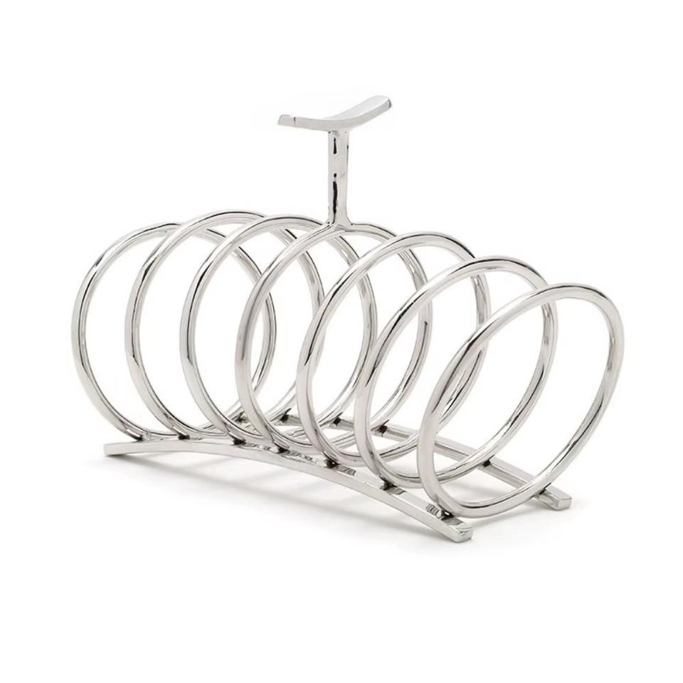 Metal bread toast holder keeps slices upright, evenly spaced