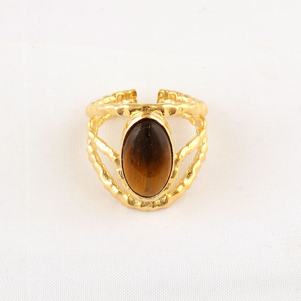 Wholesale fashion jewelry natural gemstone oval shape adjustable ring 18k gold plated designer texture three layer band rings