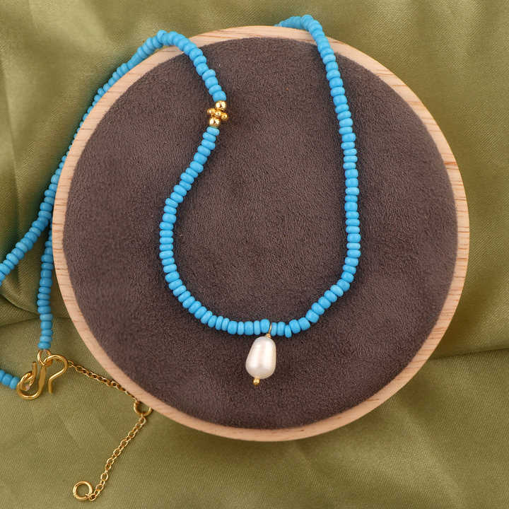 Wholesale fashion jewelry sky blue dainty beads necklace natural freshwater pearl pendant charm bohemian style beaded necklace