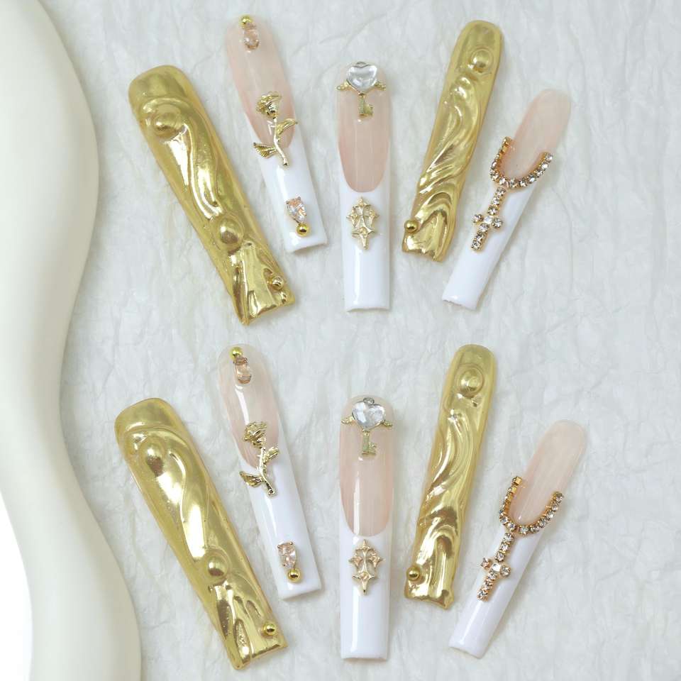 Wholesale handmade acrylic nail art, square full-coverage false nails, gold French style, rhinestone design, customizable.
