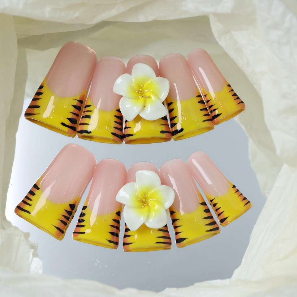 Wholesale handmade acrylic nail art, square full-coverage false nails, 3D flowers, hand-painted stripes, customization available