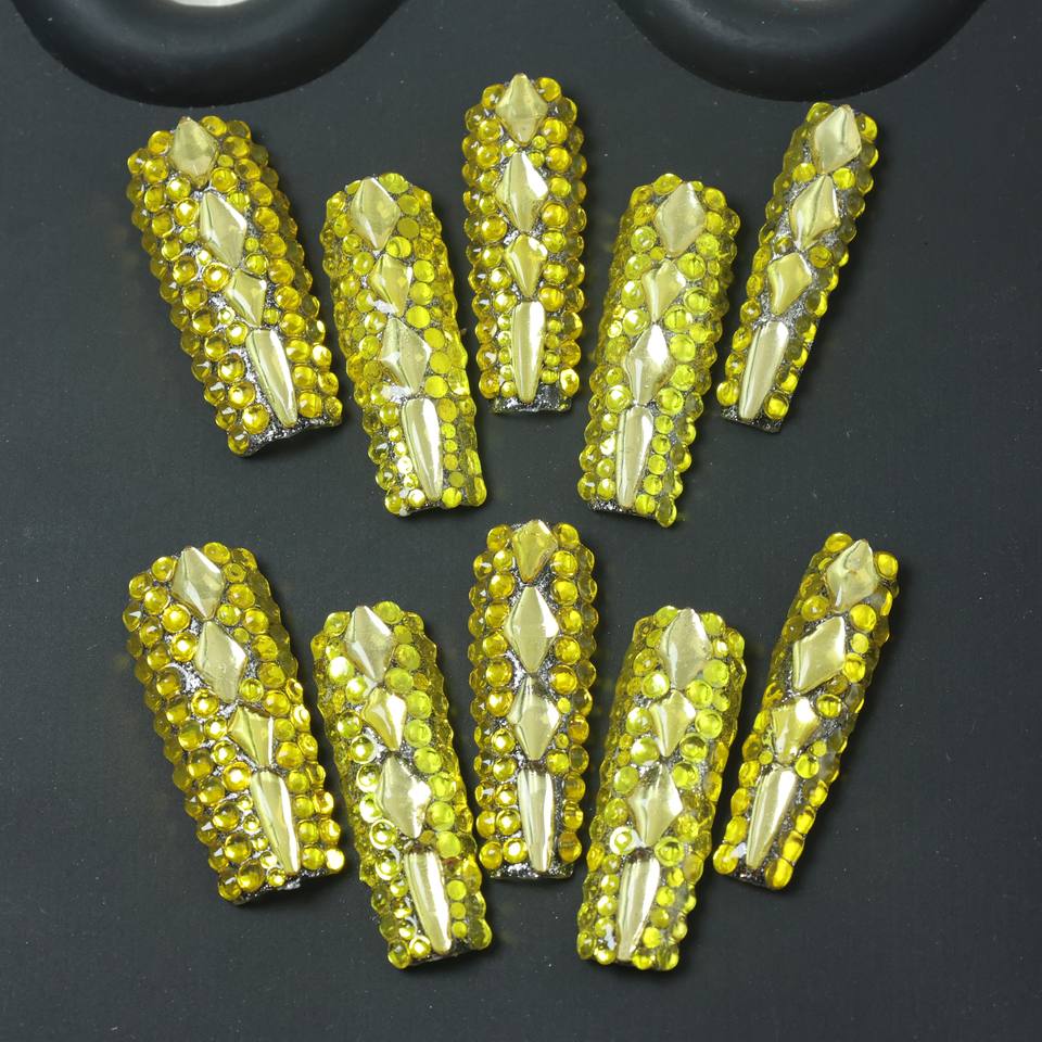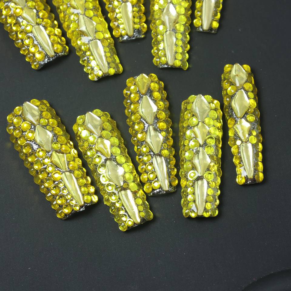 Wholesale handmade acrylic nail art, square full-coverage false nails, full yellow rhinestone design, customizable.