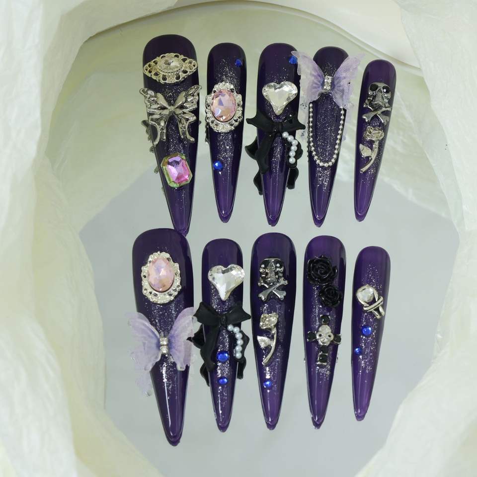 Wholesale handmade acrylic nail art, teardrop-shaped full-coverage false nails, glitter, rhinestone designs, customizable.