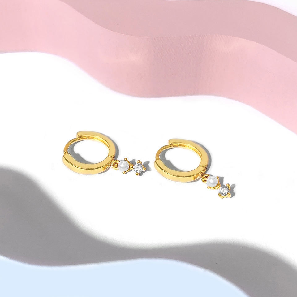 Wholesale in Stock Bulk Women Trendy 18K Gold Plated Huggie Hoop Earrings with Little Pearl and White Zircon Charms
