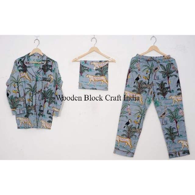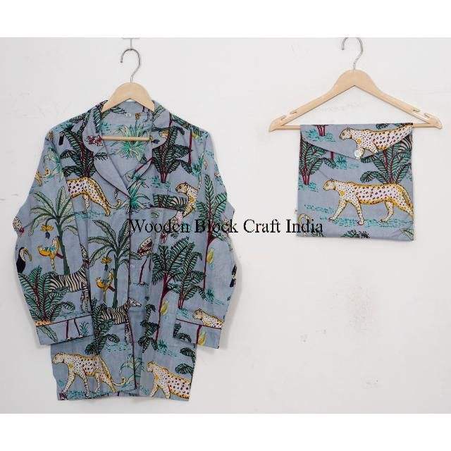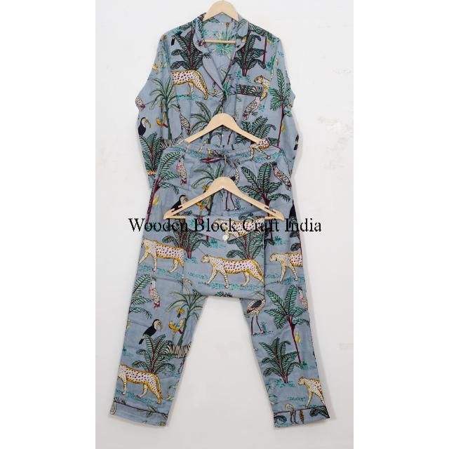 Wholesale jungle Printed Long Sleeves Pajamas Cotton Two Piece Set Casual Night Wear Sleepwear with Pocket for Women