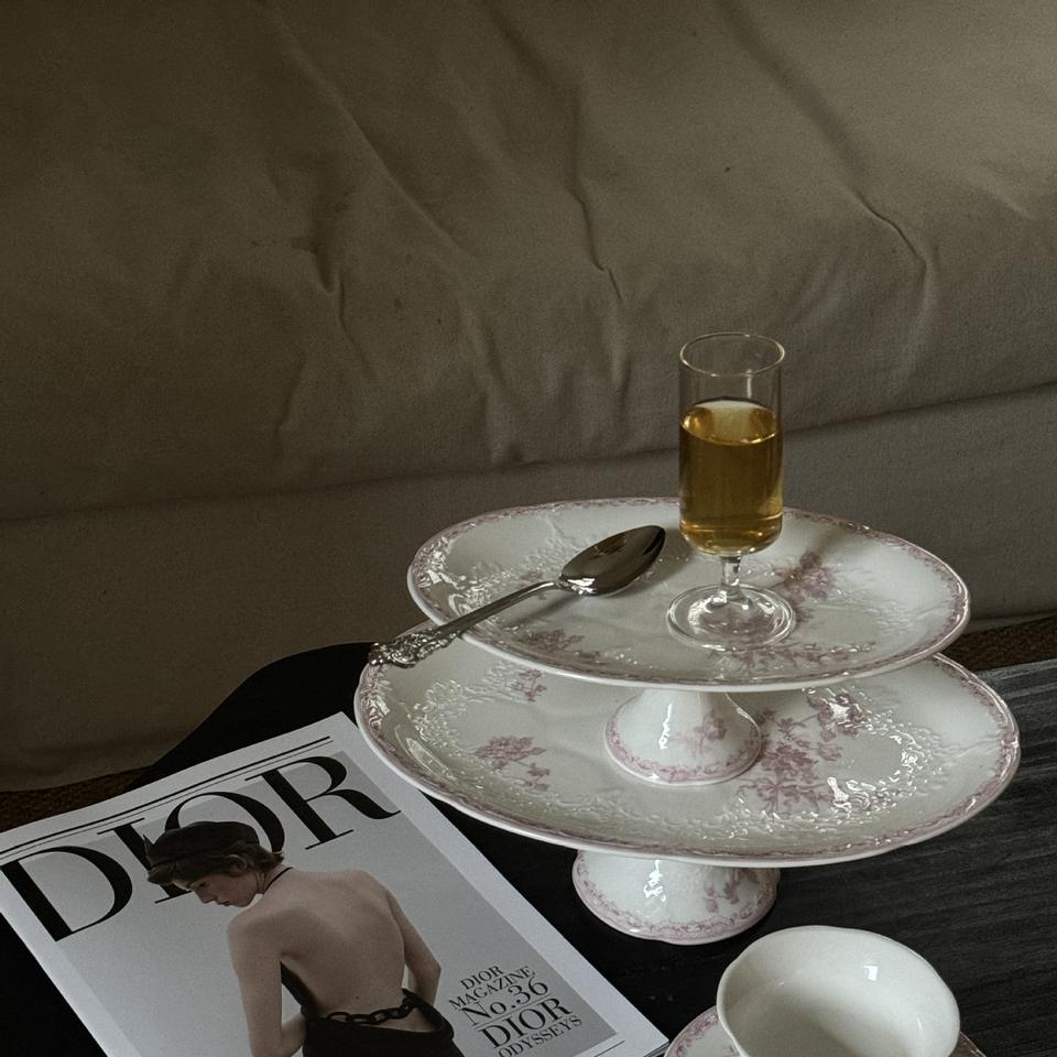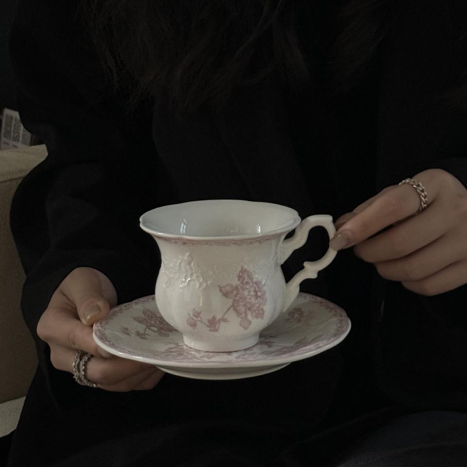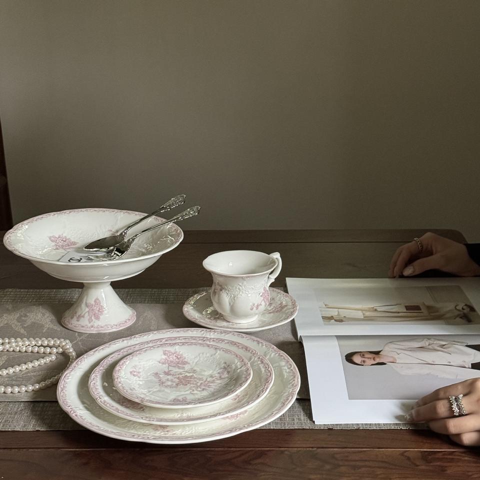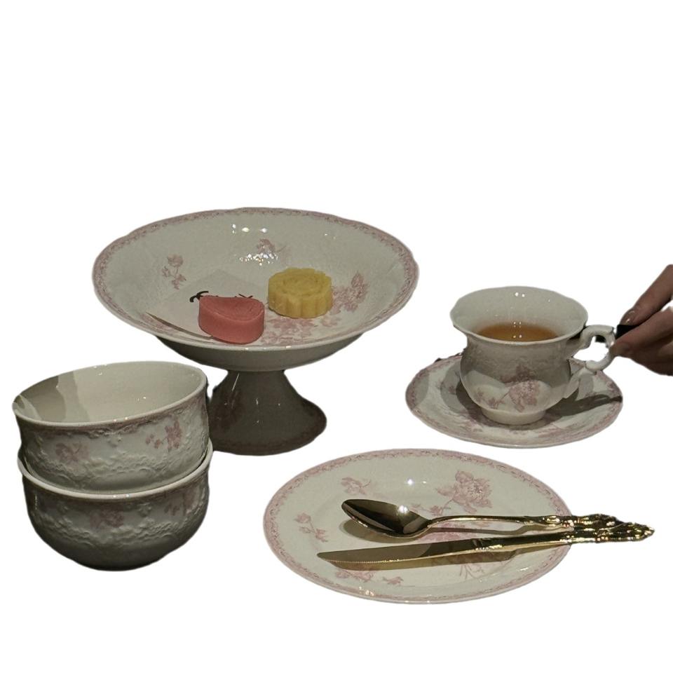 Wholesale of French mid-style heavy pink relief ceramic Western porcelain plates, coffee cups and saucers series, dessert and