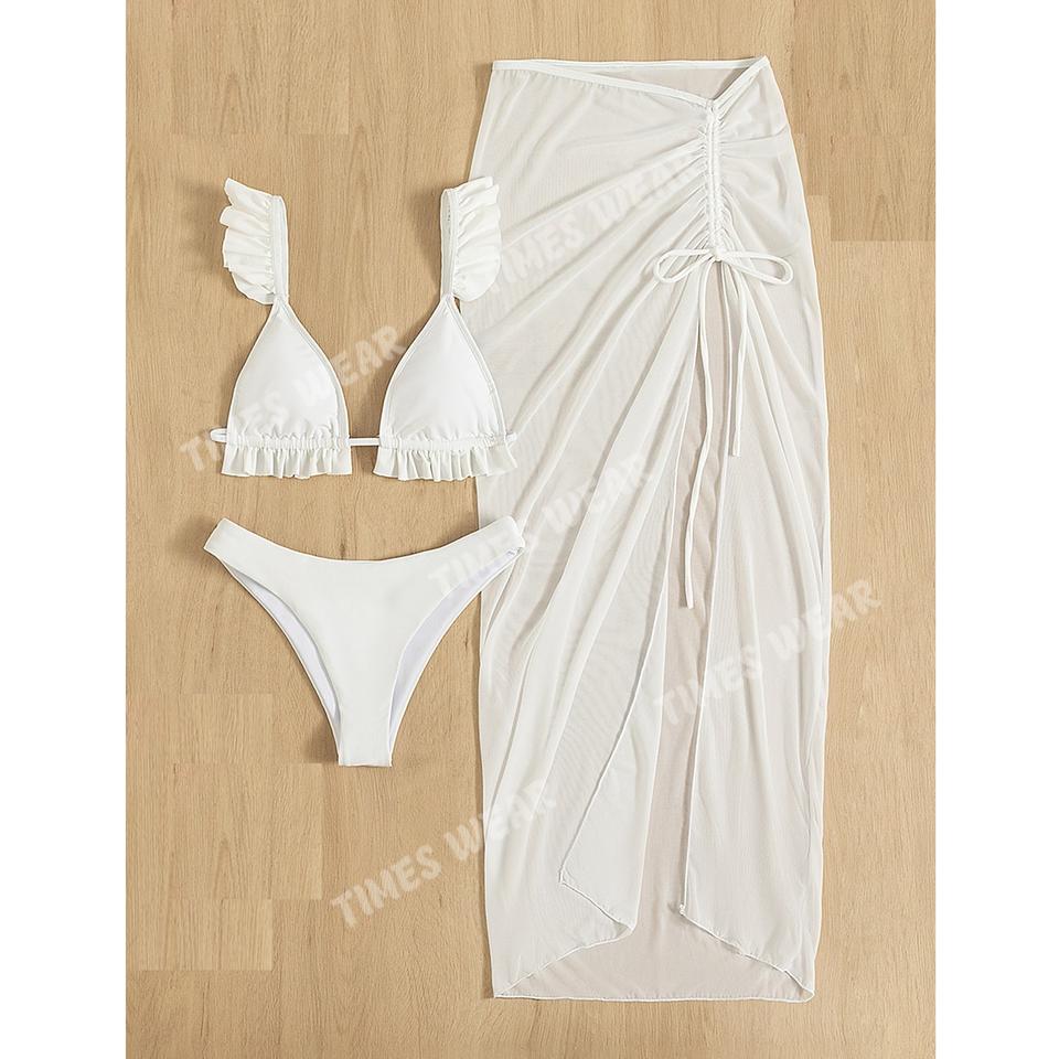 Wholesale Summer 2022 Beach Wear 3 Pack Plain Ruffle Trim Bikini Swimsuit & Beach Skirt
