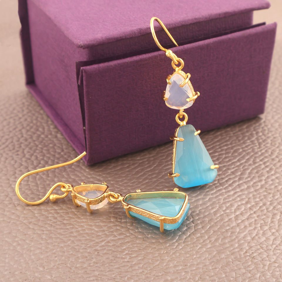 Wholesale trendy designer collection opalite & blue cats eye gemstone prong earring 2 tier hook earrings long hanging dangling