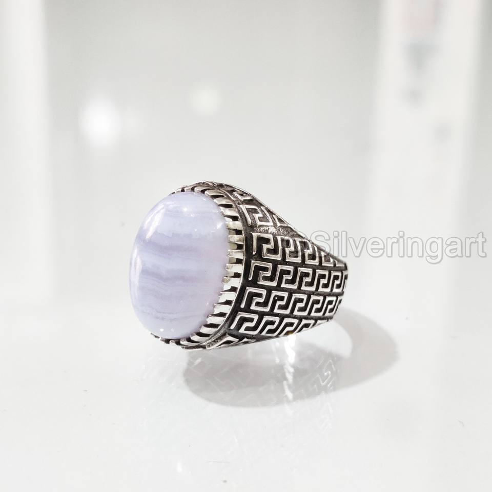 Wholesaler Men's Ring Natural AAA Blue Lace Agate Gemstone Birthstone Ring Arabic Father's Day Jewelry 925 Sterling Silver Ring