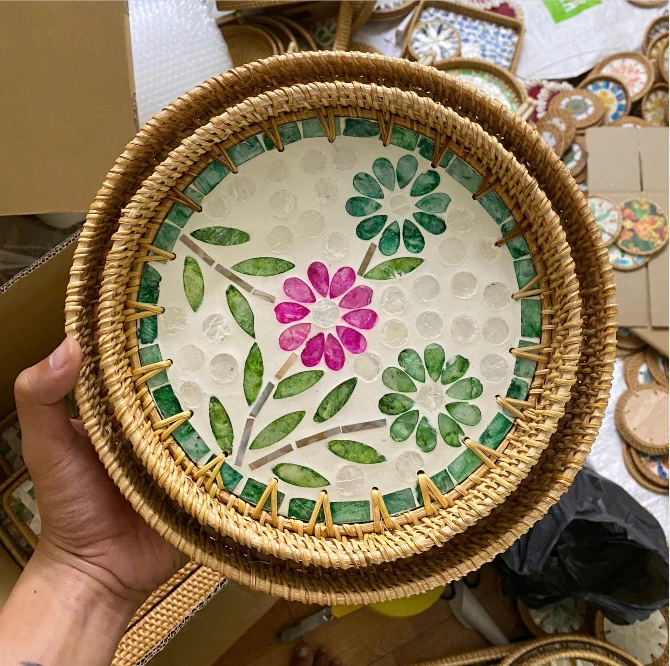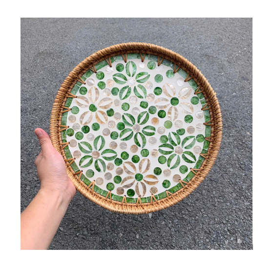 Wicker Rattan Tray with Mother of Pearl Inlay Decorative Serving Basket