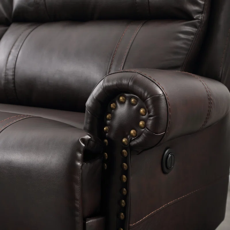 Wide Oversize Classic Round Arm Leather Power Reclining Sofa with Nail Trim Living Room Furniture