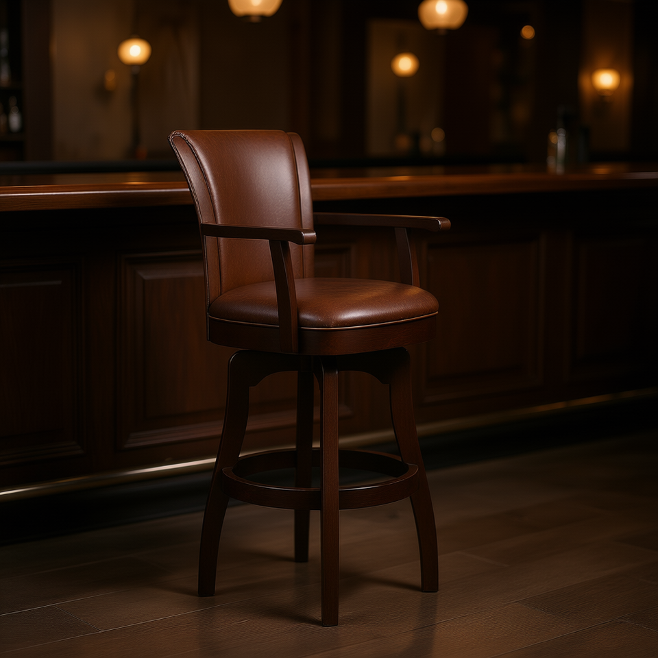 Williams Swivel Bar Stool 31in Vintage Brown Faux Leather Wood Base Armrests Home Bar Furniture